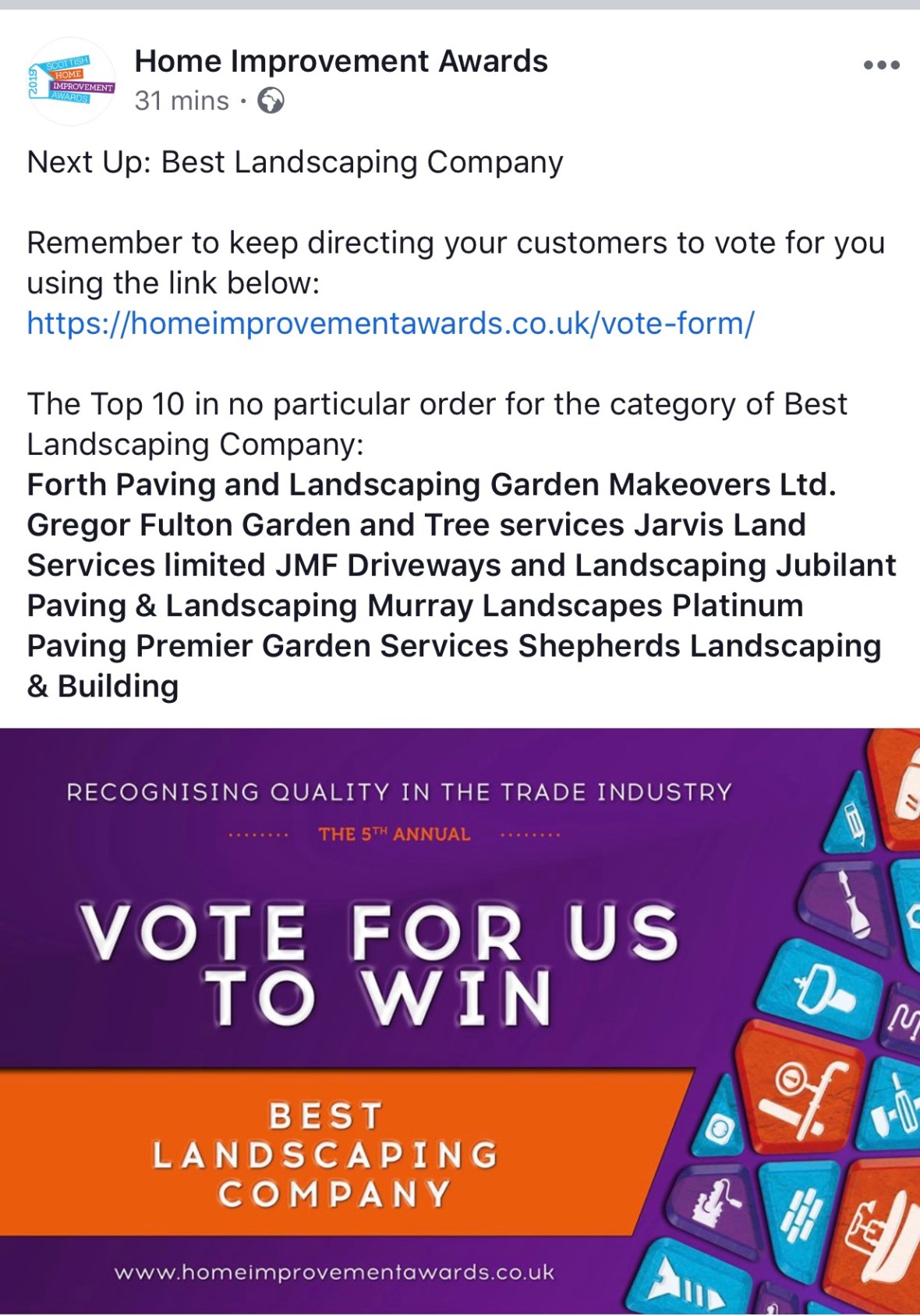 So proud to have made it into the top 10 nominations for Best Landscaping Company for this years Scottish Home Improvement Awards 🤩🤩🤩🤩😃😃😃😃 #shia2019 🤩🤩🤩 there’s still time if you’d like to vote for us, just click on the link below 🤩🤩🤩🤩