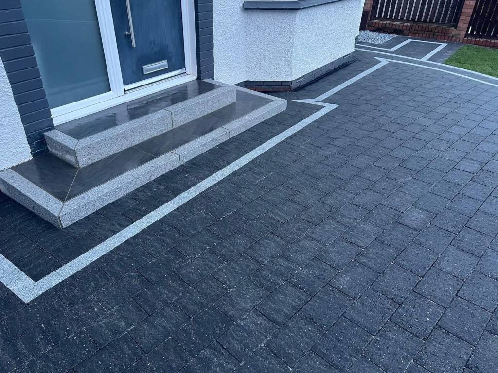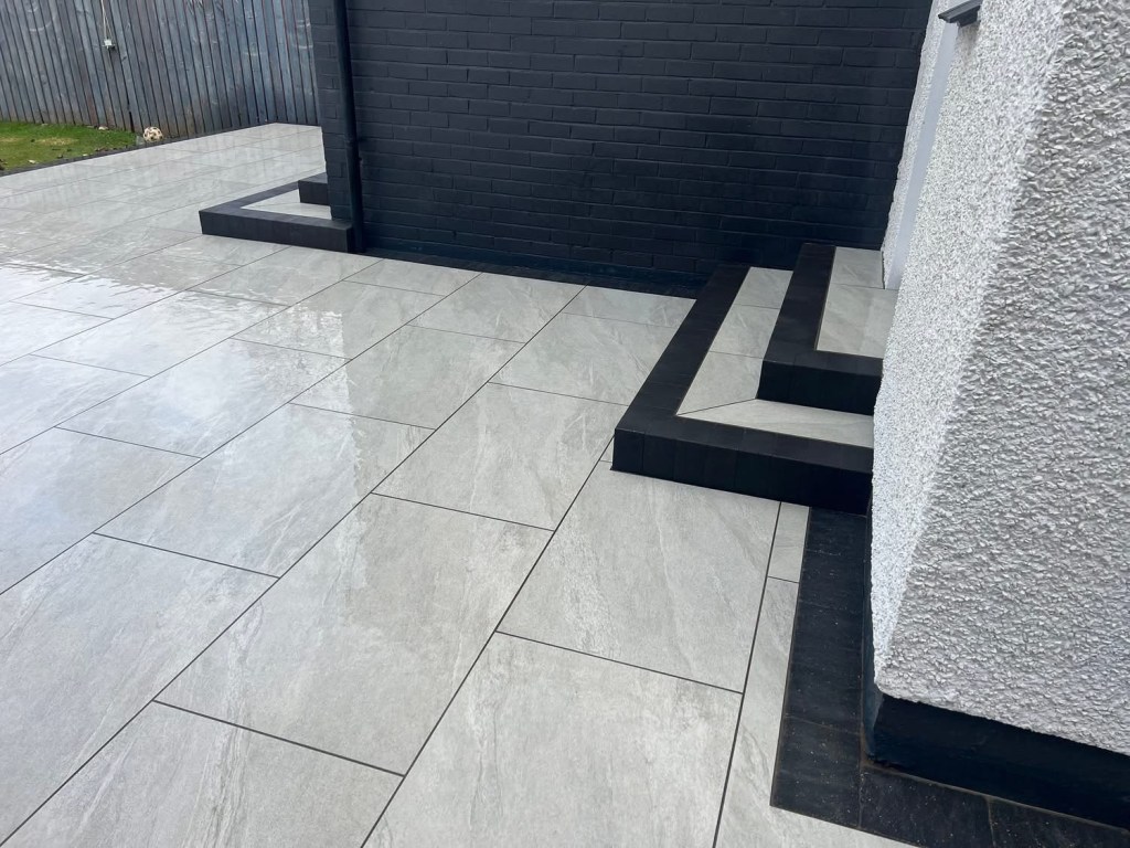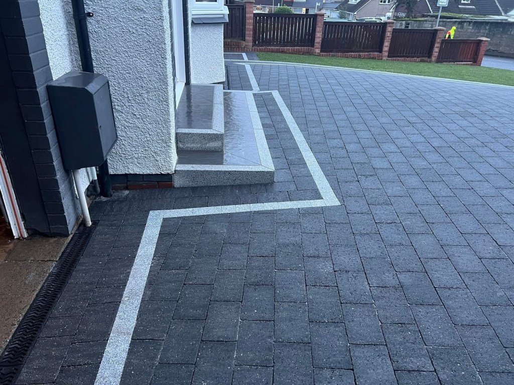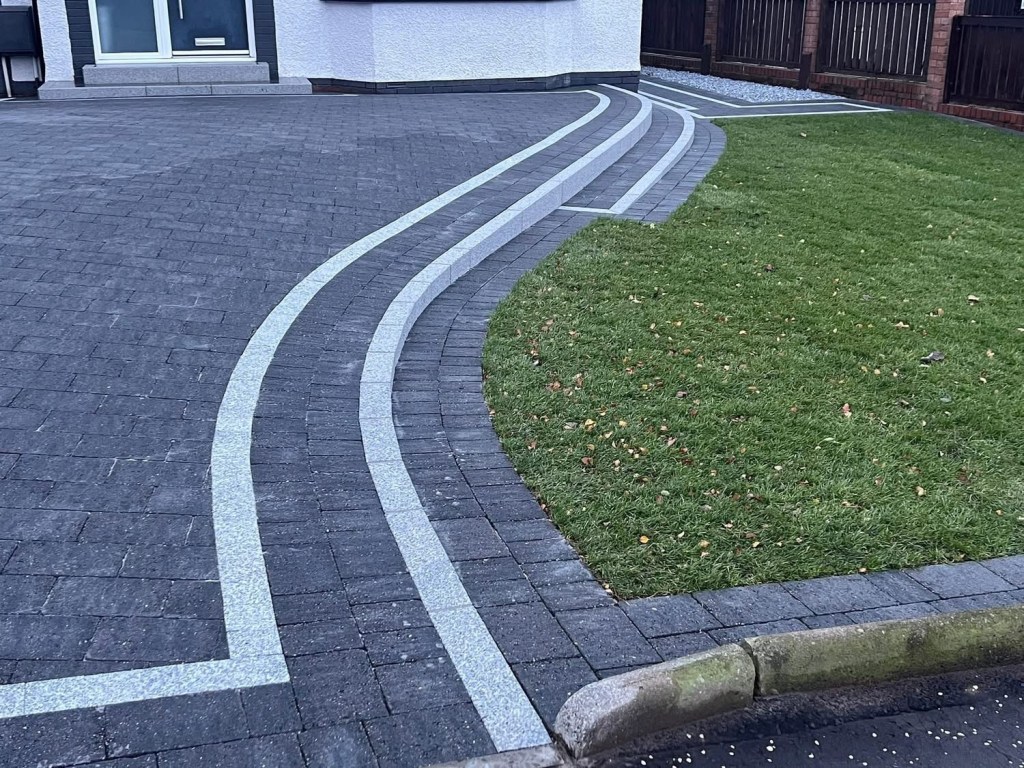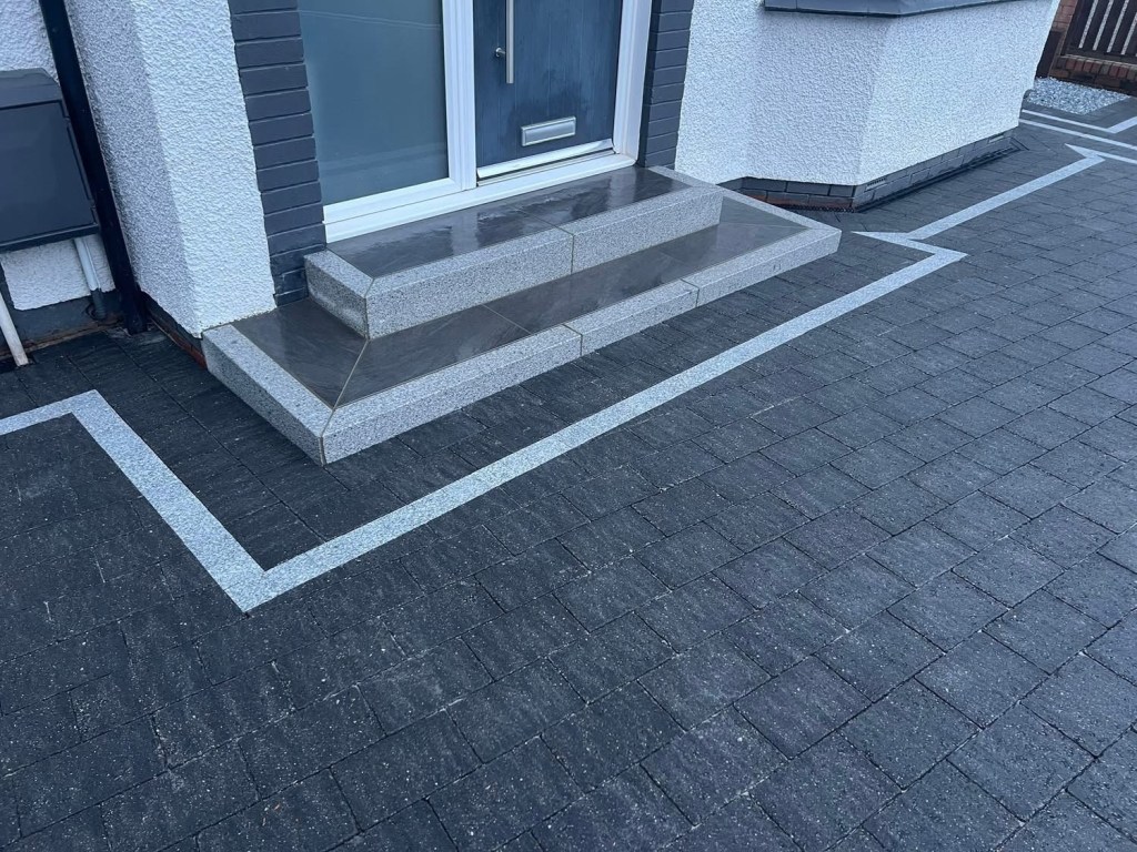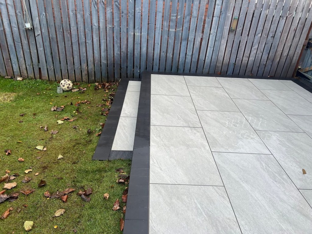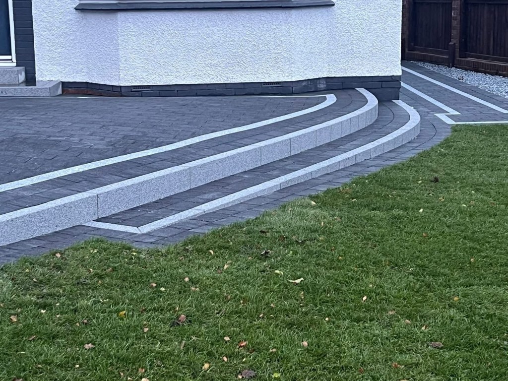β€οΈβ€οΈ job done β€οΈβ€οΈporcelain patio and trident paving border with kaber kerbs, used for risers on steps. Trident driveway with a white granite border insert. White granite kerbs and steps. And new turf for the lawn.