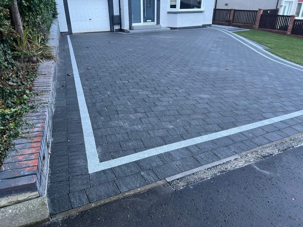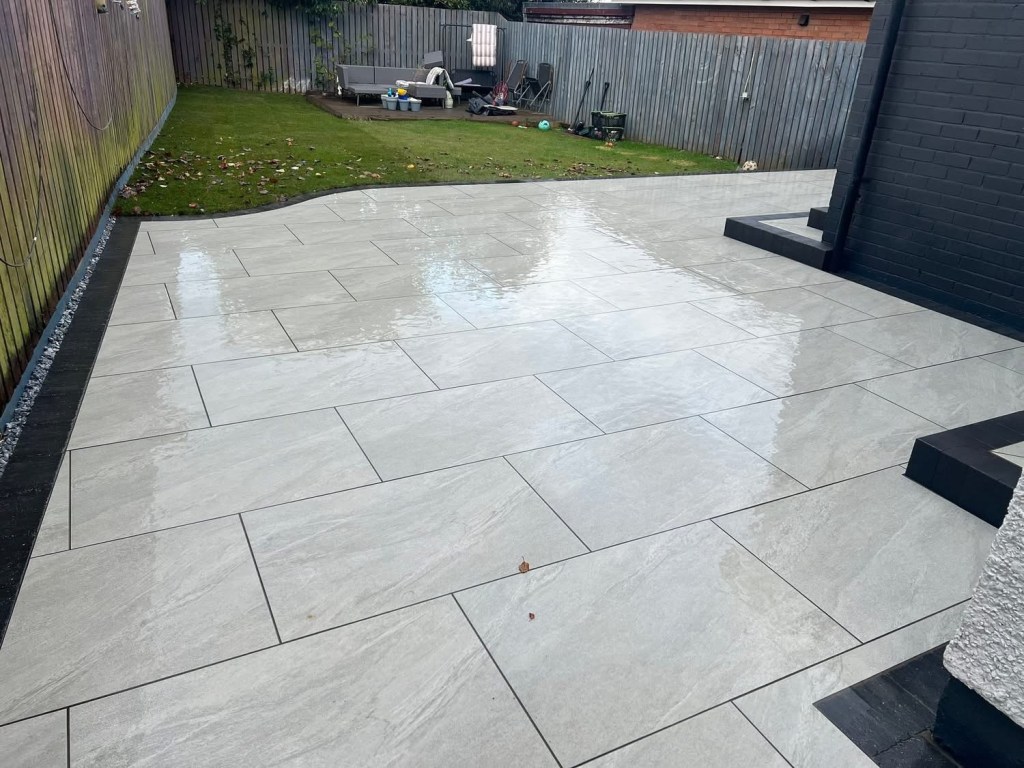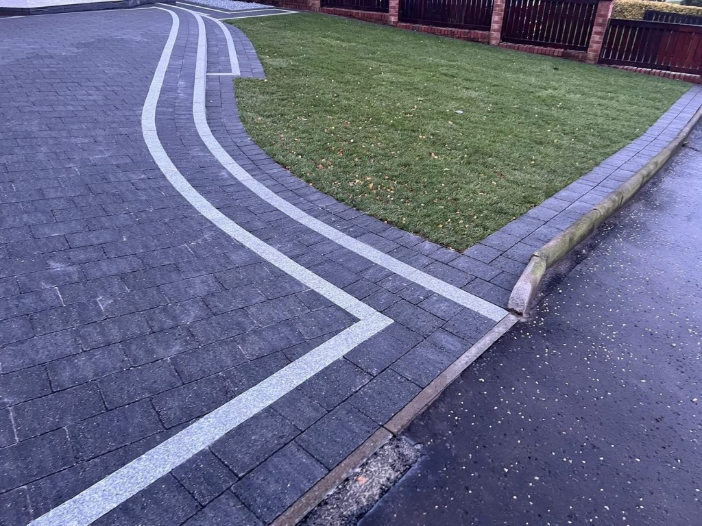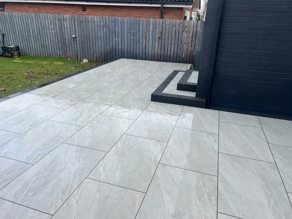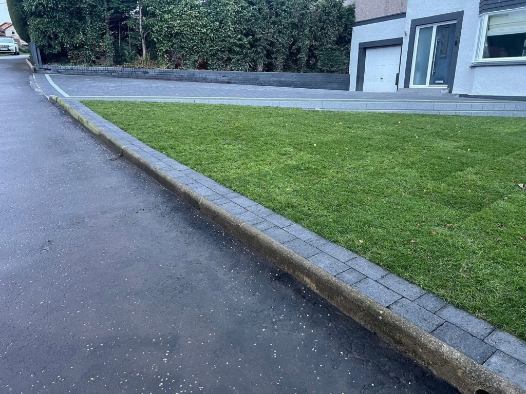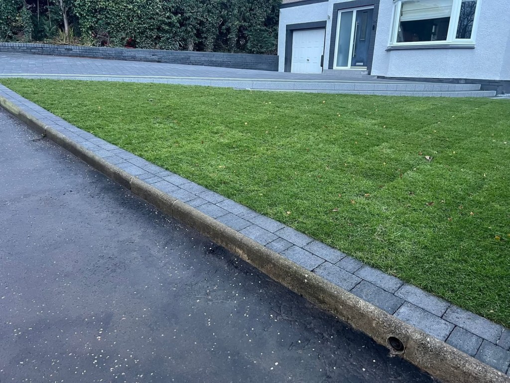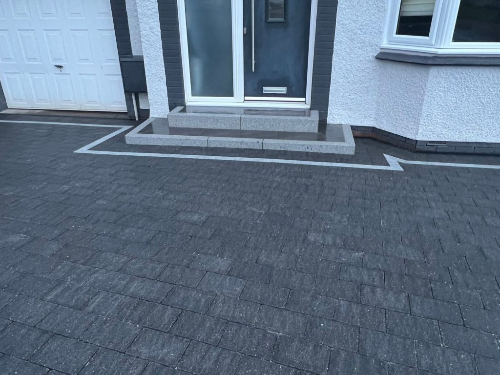 β€οΈβ€οΈ job done β€οΈβ€οΈporcelain patio and trident paving border with kaber kerbs, used for risers on steps. Trident driveway with a white granite border insert. White granite kerbs and steps. And new turf for the lawn.