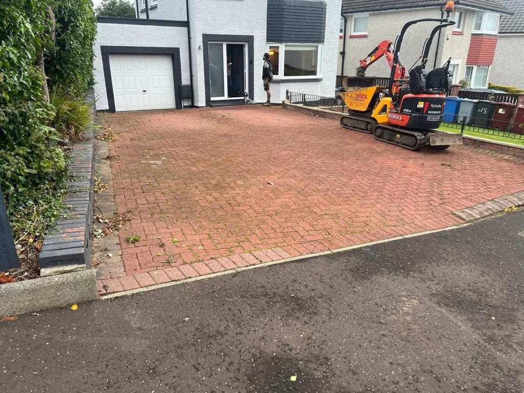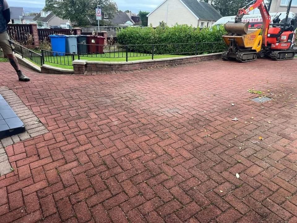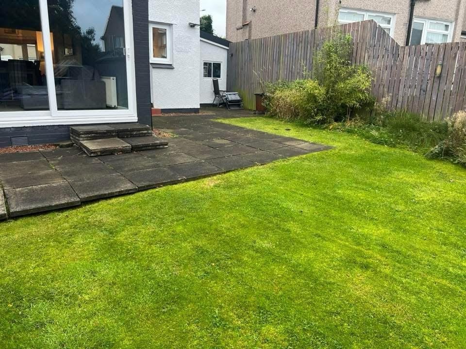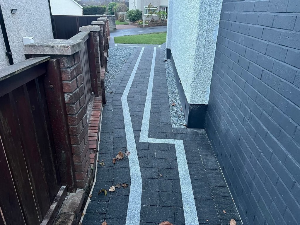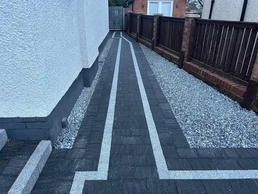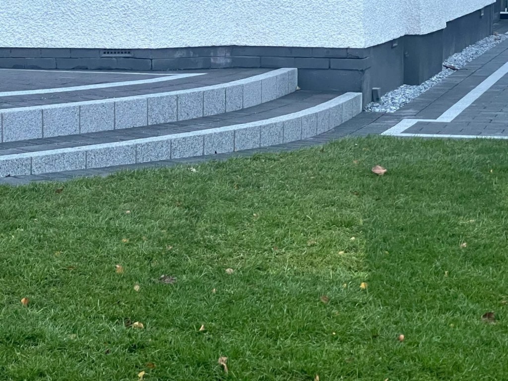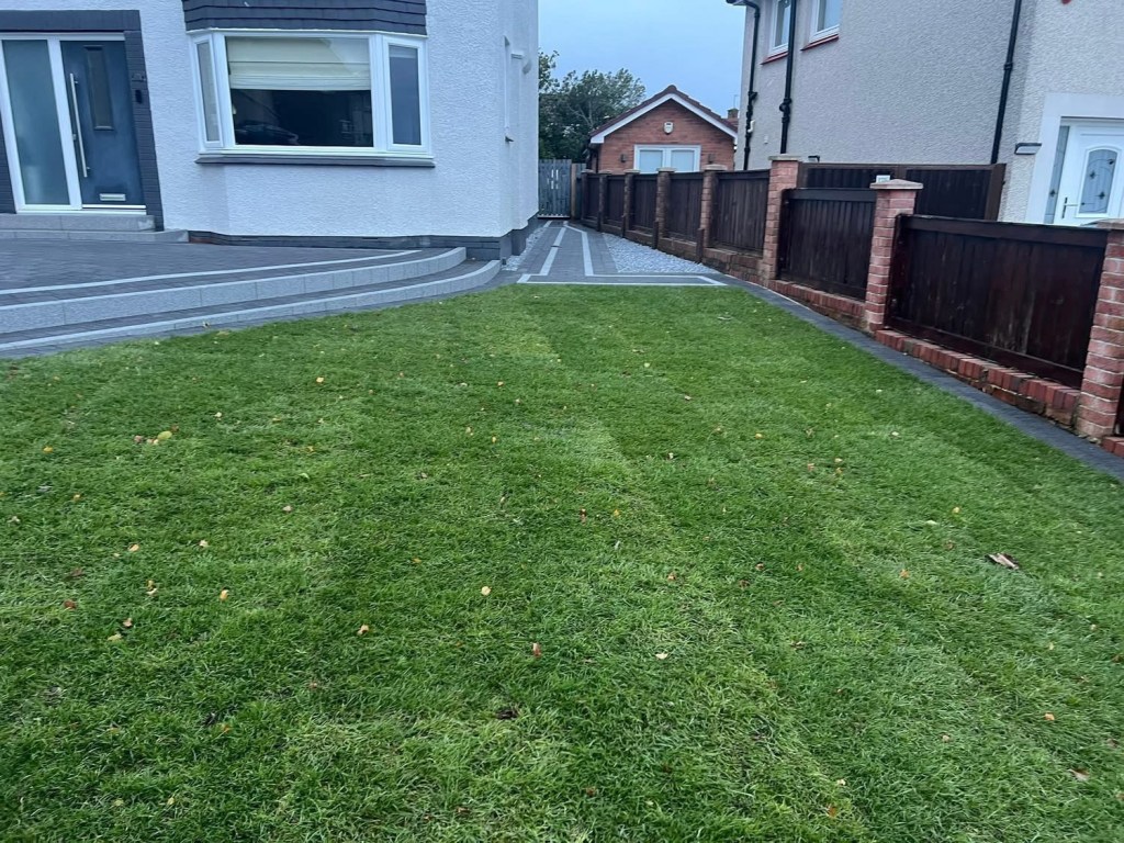 β€οΈβ€οΈ job done β€οΈβ€οΈporcelain patio and trident paving border with kaber kerbs, used for risers on steps. Trident driveway with a white granite border insert. White granite kerbs and steps. And new turf for the lawn.